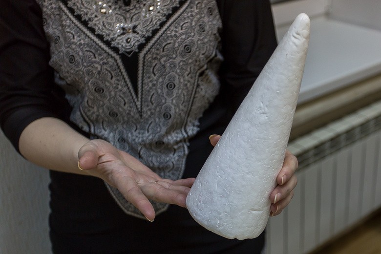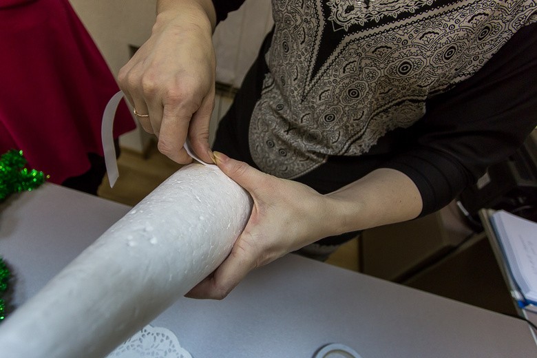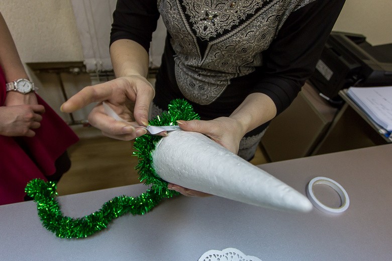 - Шаг 2. Сборку нашей будущей новогодней ёлочки начинаем с её нижней части, обматывая картонный конус первым рядом мишуры.