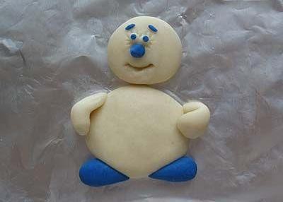 - Из кусочков белого теста делаем ручки, одну их которых немного закругляем для того, что бы затем в ней разместить метлу. Ноги лепим из теста синего цвета. Пуговицы так же делаем синими и крепим их к туловищу, смазав предварительно водой те места, где их будем размещать.