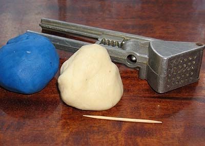 - Для метлы, при помощи прибора для выдавливания чеснока делаем немного синих колбасок. Затем оборачиваем их тоненькой белой колбаской. В руку снеговика вставляем зубочистку и крепим к ней готовую часть метлы.
