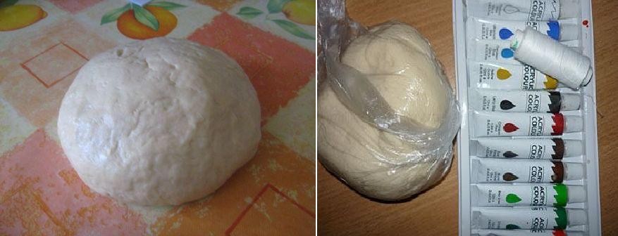 - Для приготовления теста вместе смешиваем муку, соль и крахмал. Затем добавляем клей и вымешиваем. Теперь маленькими порциями вливаем воду, пока тесто не станет похожим на мягкий пластилин. Оно обязательно должно стать эластичным, для этого воду необходимо вливать постепенно, что бы не переборщить. Затем его нужно долго вымешивать для того, что бы вся соль полностью растворилась. Это позволит избежать появлению в поделке неприятных крупинок.