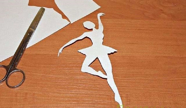 - Делаем шаблон из распечатанной фигуры балерины, переносим её на приготовленный белый картон и вырезаем.