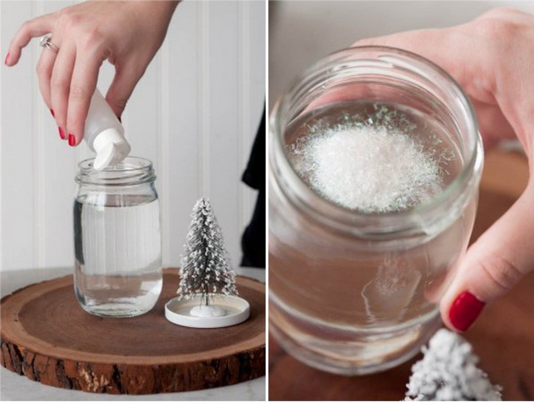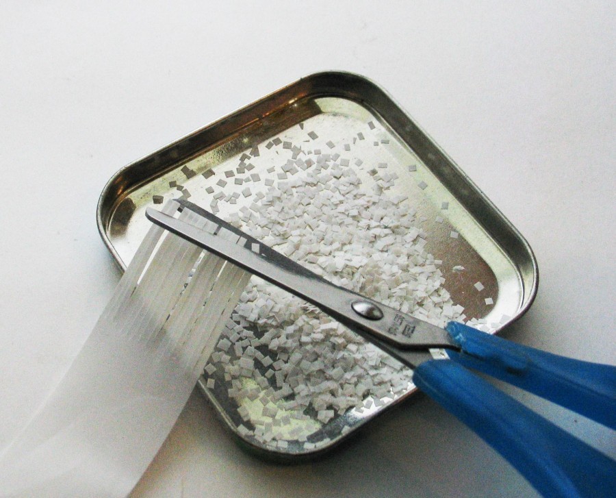 - В баночку наполненную жидкостью всыпаем блёстки, крупинки пенопласта и нарезанную очень мелко мишуру.