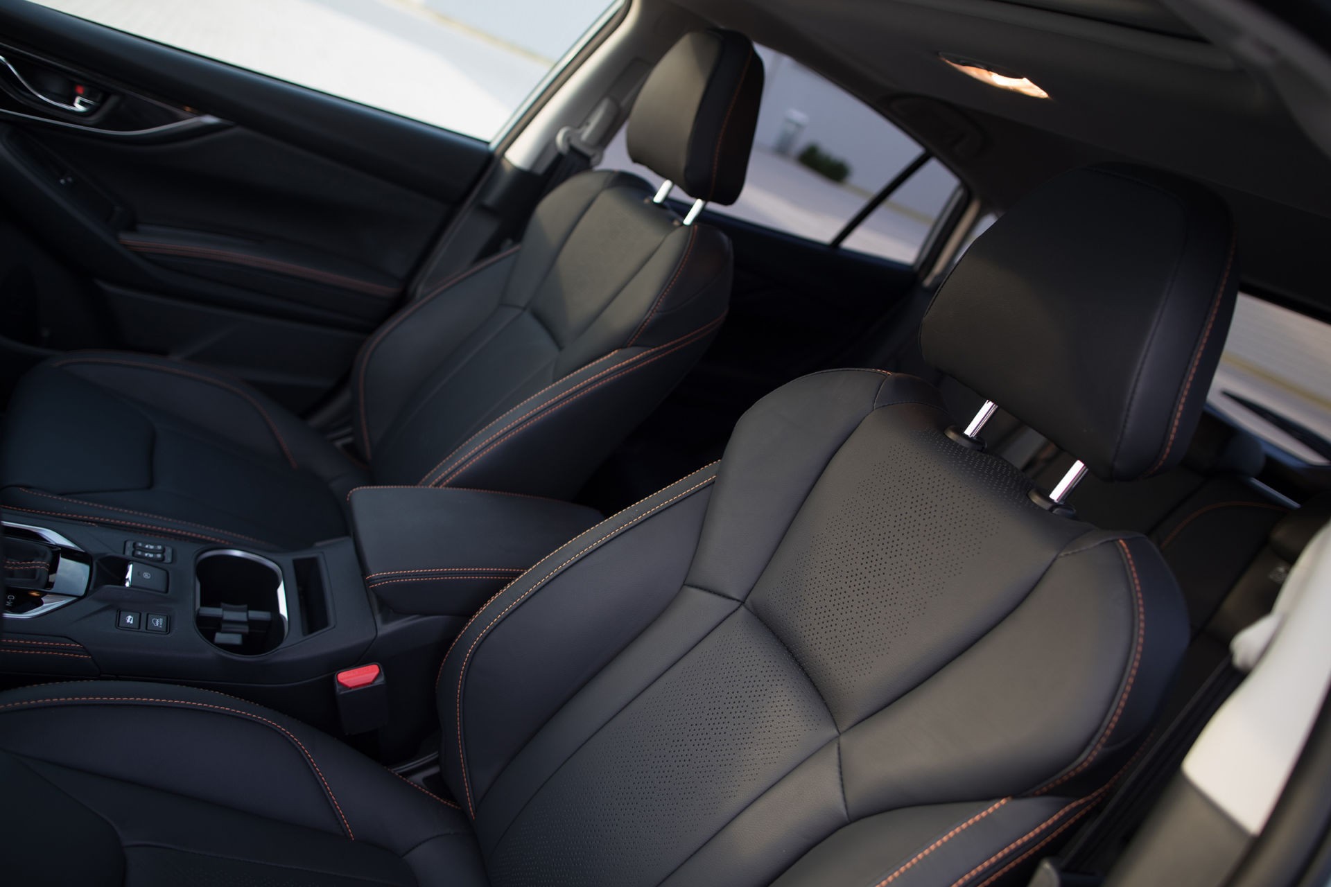 При первом знакомстве с салоном новинки Субару, первое, что привлекает внимание – это видоизменённые сидения. Почему именно эта деталь сразу обращает на себя внимание? Потому что ярко-оранжевая строчка на фоне тёмно-серого цвета обивки передних кресел и такого же цвете передней панели, смотрится очень эффектно.