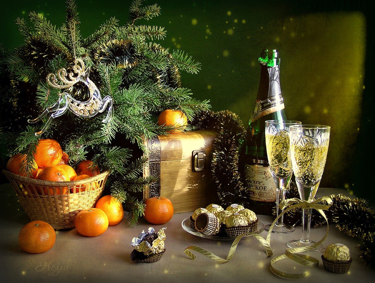 - Новогодняя феерия для семьи. Аксессуары традиционного празднования самой долгожданной ночи в году: советское шампанское, мандарины, маски различных животных, бенгальские огни, гирлянды, хлопушки, фейерверки, конфетти, диск с новогодними песнями. Интересный вариант упаковки – детские санки или большая ледянка, на которые как на подносе укладываются все составляющие веселого праздника.