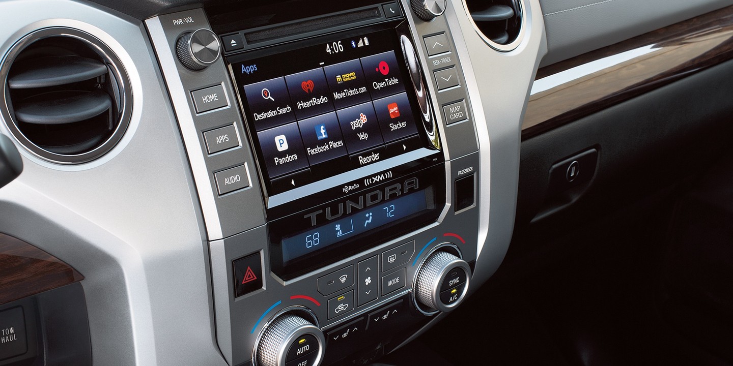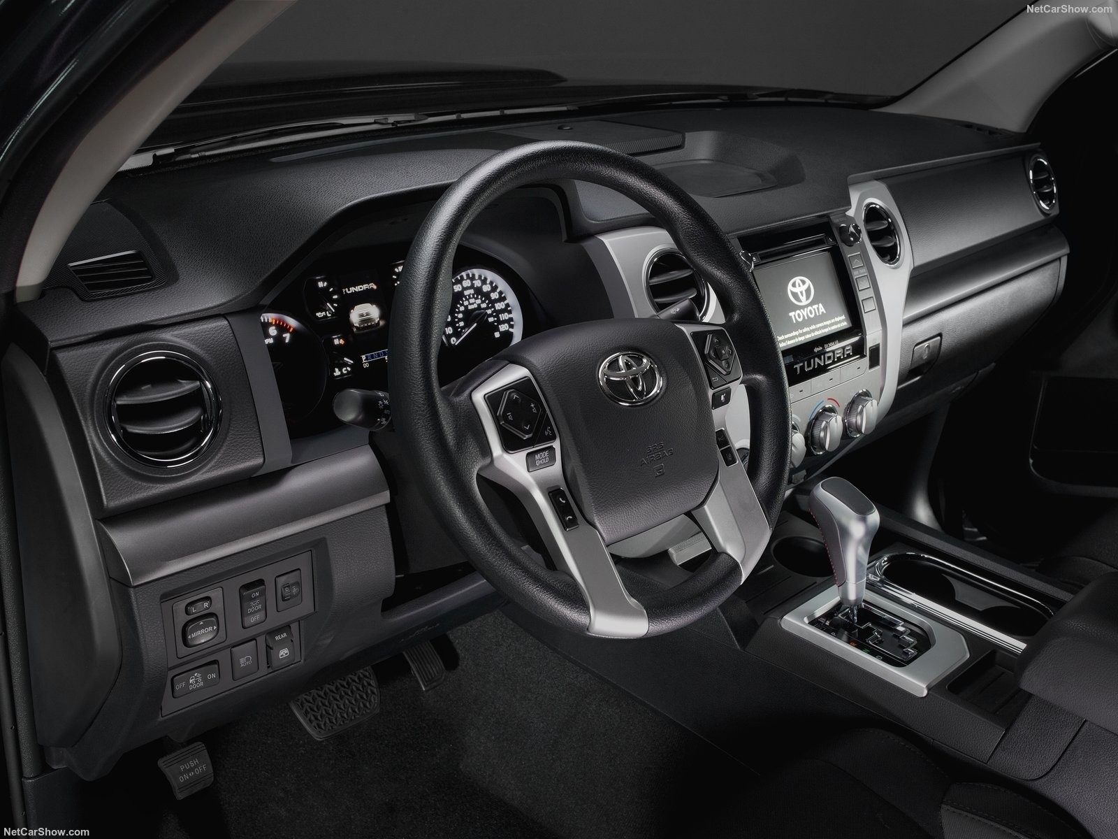 Можно смело сказать, что внутреннее убранство новой Toyota Tundra отвечает всем требованиям ее назначения – автомобиль отлично подходит тем, для кого он служит в роли грузовика и внедорожника. Здесь все просто и понятно, но в то же время очень удобно, особенно для тех, кто не любит разбираться в несметном множестве мелких кнопок. Но в то же время модель характеризуется как хорошо оснащенная бортовой аппаратурой, ведь панель приборов обладает всеми необходимыми указателями и датчиками, расположенными грамотно и доступно; в то же время они имеют гармоничную круглую форму, а когда темнеет, циферблаты приобретают очень приятный голубой свет, ничуть не раздражающий зрение водителя.