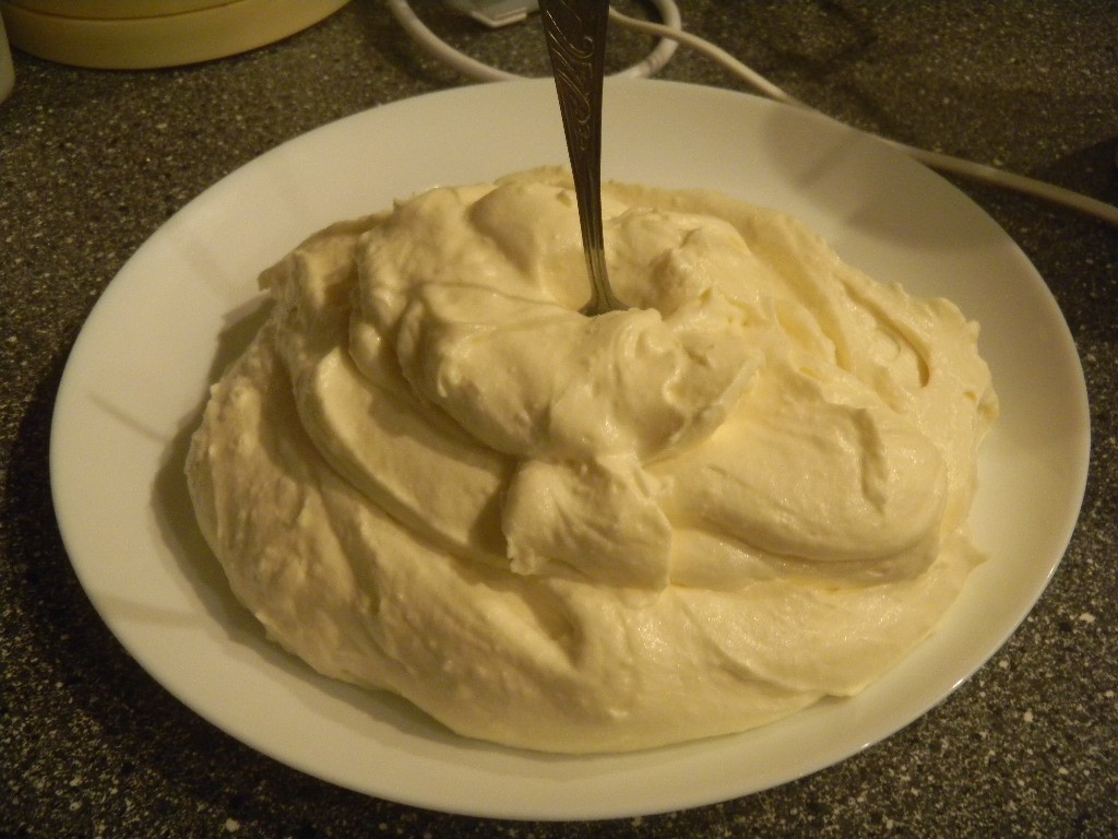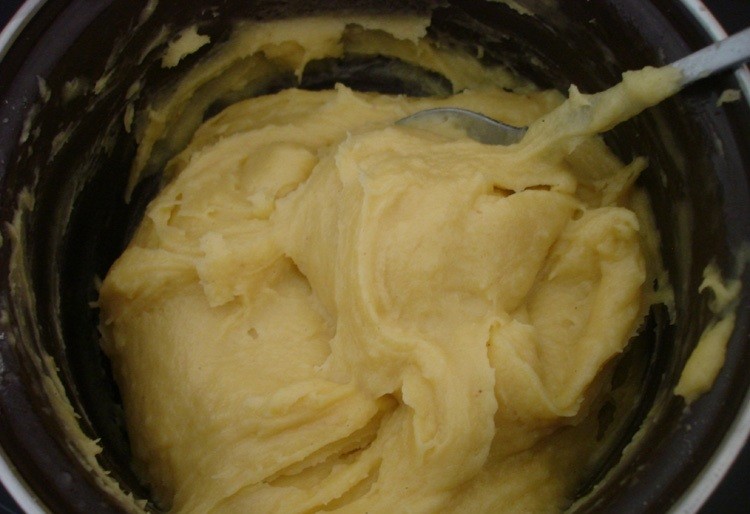 - Будущему тесту даём время, чтобы оно остыло, а потом вбиваем в него по одному все яйца, при этом не прекращая вымешиваем тесто. В результате, готовое тесто должно напоминать густой крем и иметь однородную структуру. Помните, что нельзя вбивать яйца в горячее тесто потому, что белки могут свернуться и тесто будет не пригодным для приготовления профитролей.