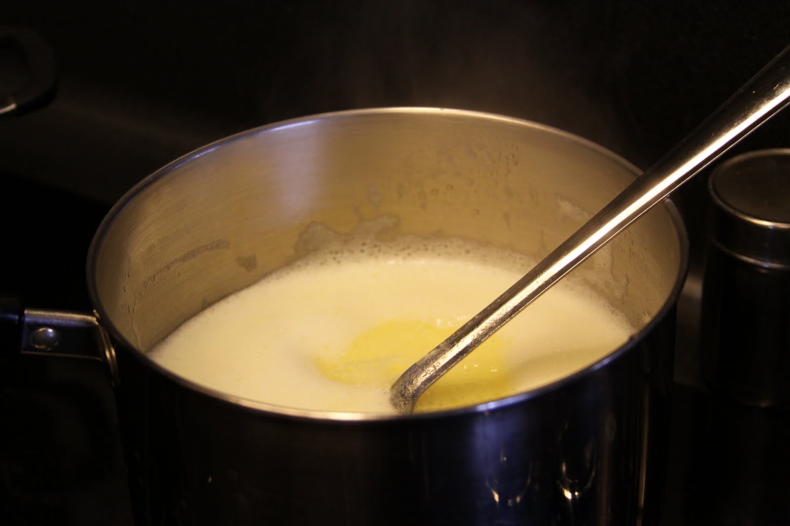 - В специально приготовленную ёмкость вливаем воду и ставим её на включенную плиту. В подогретую воду добавляем порезанное масло и соль. Непрерывно помешиваем, пока масло не раствориться в воде.