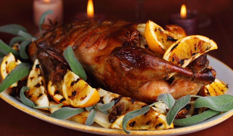 - Горячую утку нужно обильно полить приготовленным соусом и украсить запечёнными дольками апельсина. Блюдо можно подавать к столу.