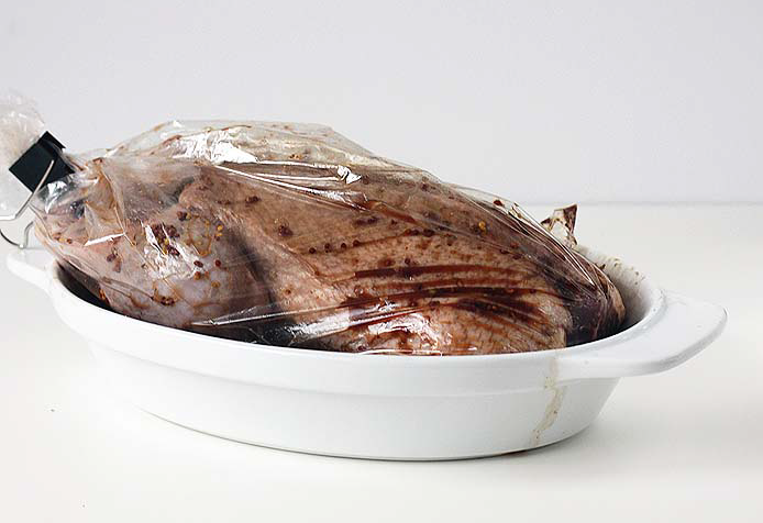 - Ножки и крылья утки крепко прижимаем к туловищу и сильно связываем нитью между собой. Это замедлит испарение влаги и позволит мясу не утратить в процессе запекания свои вкусовые качества. Мясо при этом останется сочным и мягким.