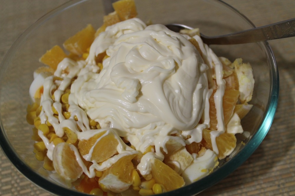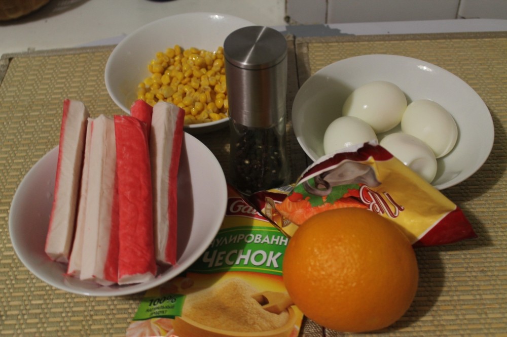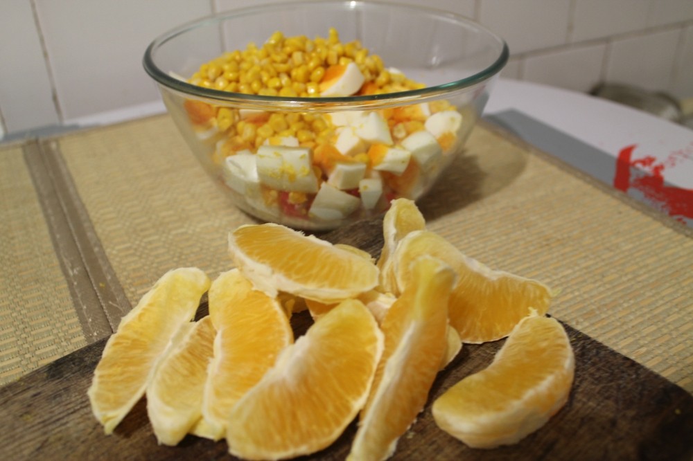 - Подготовленные ингредиенты выкладываем шарами в подготовленную салатницу в следующем порядке: крабовые палочки, кукуруза, яйцо, апельсин.