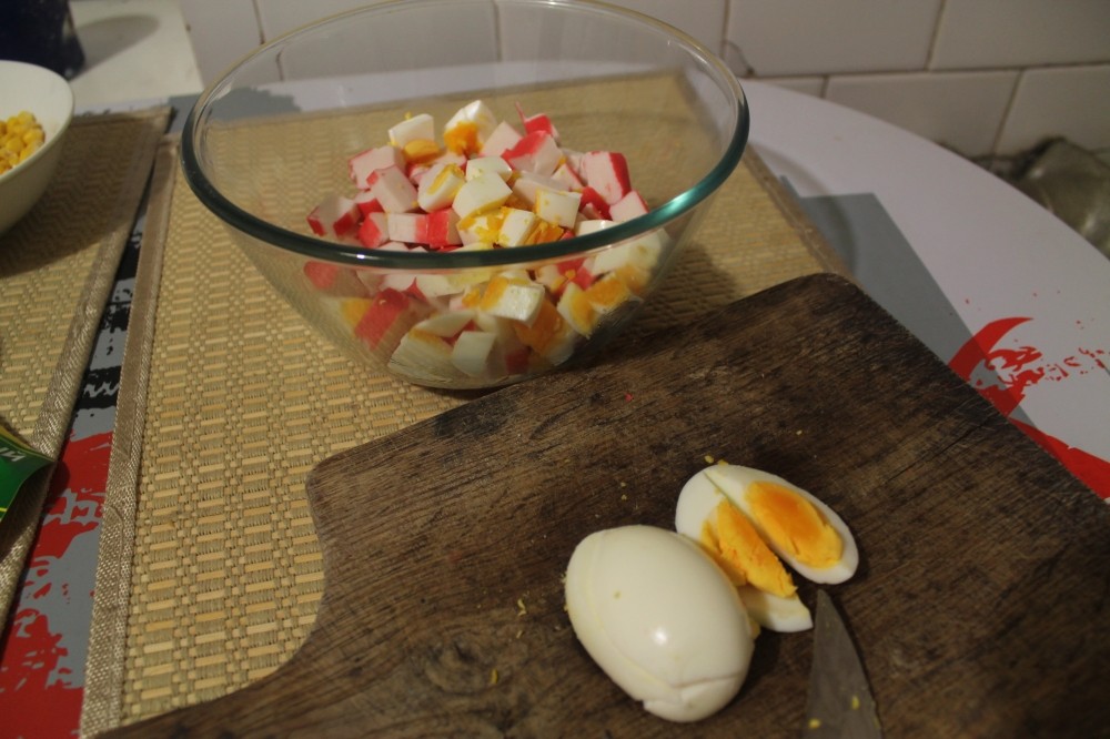 - Вареное яйцо чистим от скорлупы и нарезаем мелкими квадратиками.