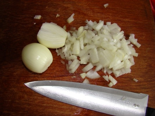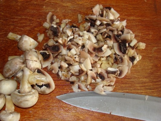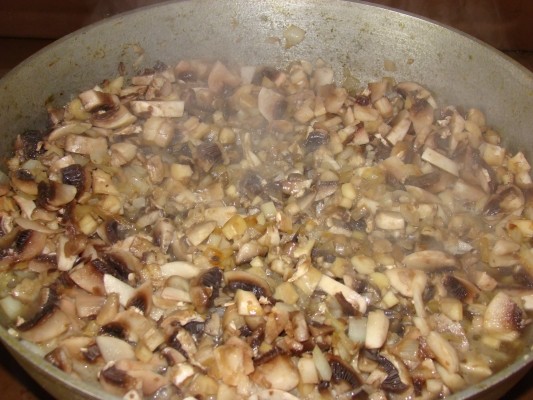 - Промойте грибы и лук, нарежьте их. В разогретую без масла сковороду высыпьте грибы и обжаривайте до тех пор, пока жидкость полностью не испарится, затем добавьте лук и растительное масло и обжарьте до готовности.