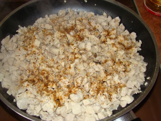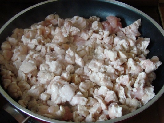 - Отварите куриное филе, остудите и нарежьте небольшими кубиками.