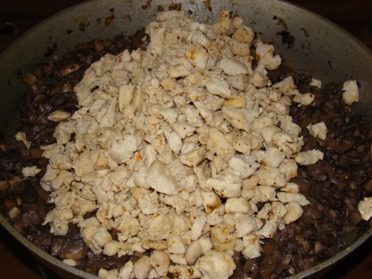 - Добавьте к грибам кубики филе и перемешайте, добавьте специи.