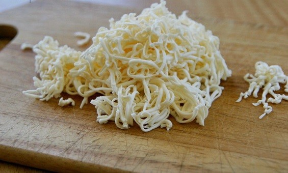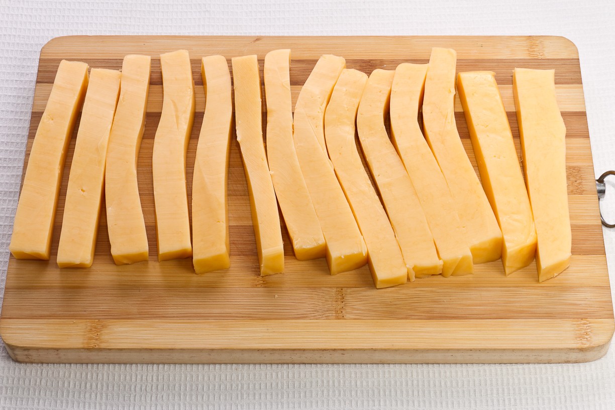 - Прежде всего нужно подготовить сыр, нарежьте его пластинками или брусочками, толщиной 1,5 см., но не менее 1 см., чтобы блюдо не «расползалось» по сковороде.