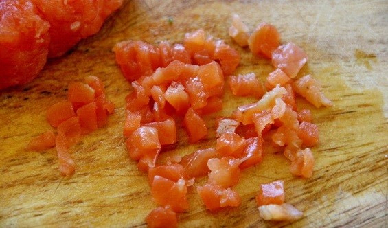 - Ополосните зелень и промокните ее бумажными салфетками или полотенцем, после чего мелко нарубите и добавьте к филе и сыру.