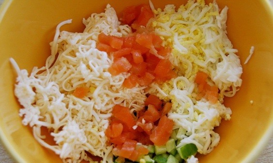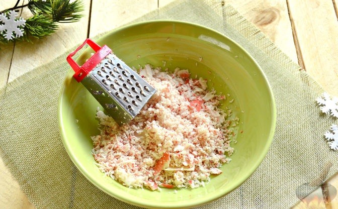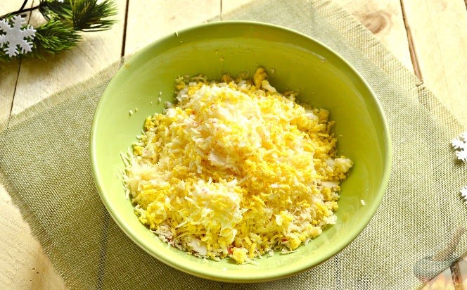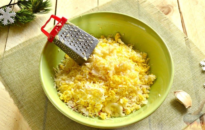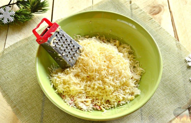 - Добавьте соус или майонез и тщательно перемешайте. Скатайте шарики, по размеру такие, как елочные игрушки.
