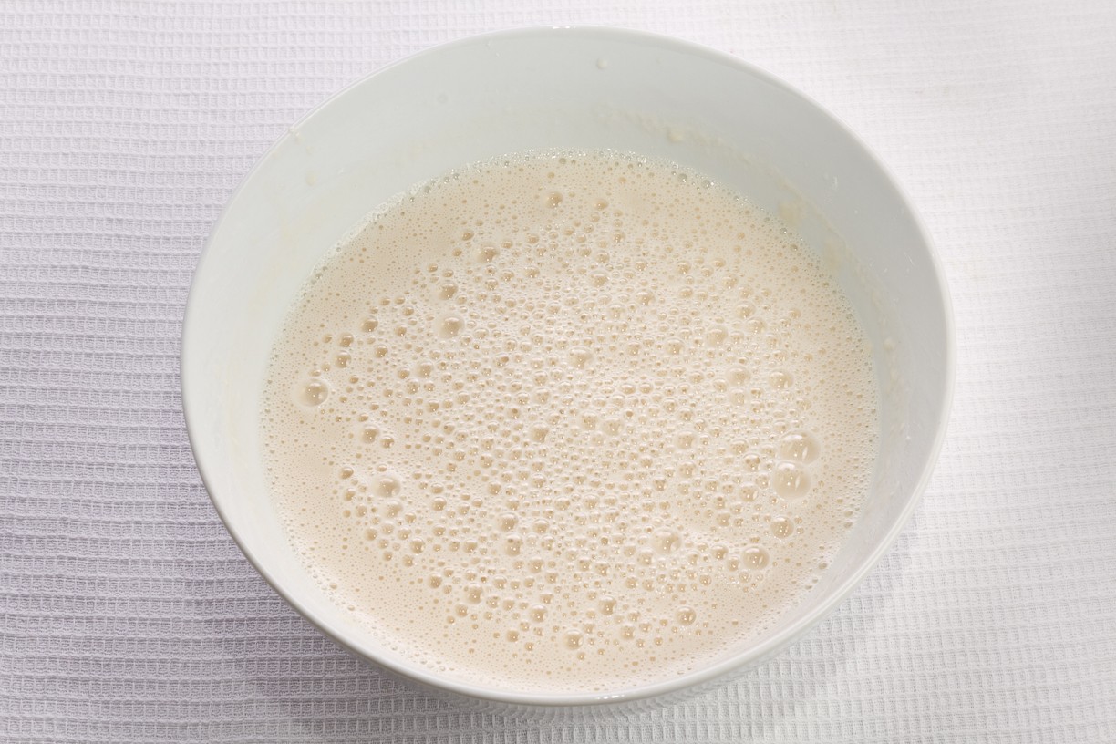 - Далее нужно смешать между собой сухие ингредиенты и постепенно добавляя их к жидким компонентам. Активно помешивайте тесто, чтобы не образовывались комочки. После того как тесто будет готово, добавьте растительное масло и снова перемешайте – это делается для того, чтобы блины не подгорали.