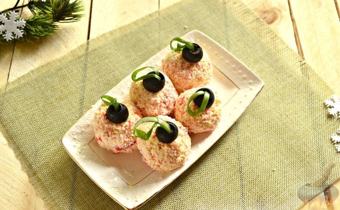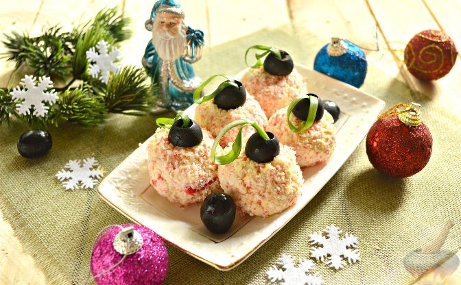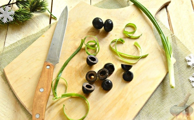 - Оливки разрежьте пополам и поставьте половинку на каждый шар. В качестве веревочки для этих съедобных украшений можно использовать веточки укропа, петрушки, а также перья зеленого лука.