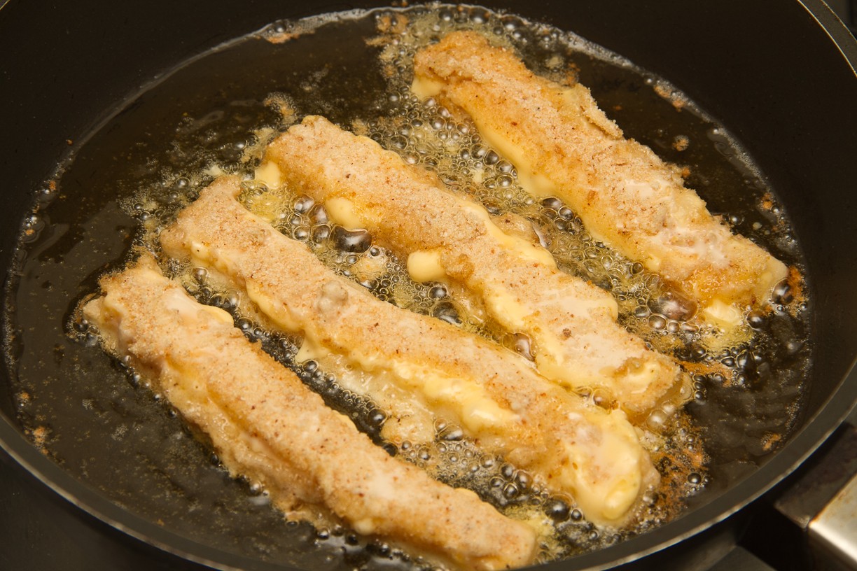 - Обваляйте сырные пластинки в панировке и обжарьте до золотистой корочки – это может занять от 1 до 3 минут, в зависимости от сыра.